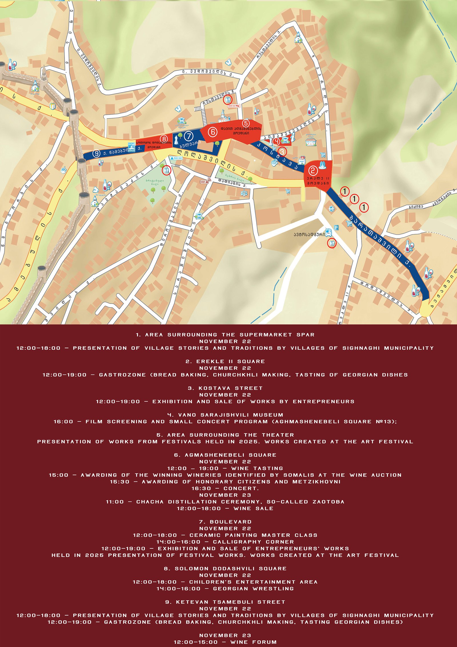 12:00-18:00 - Presentation of village stories and traditions by villages of Sighnaghi Municipality (Ketevan Tsamebuli Street and King Erekle II Square);